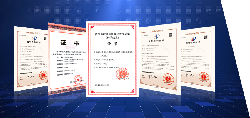 授权专利56项 发明专利39项 承担科技项目20余项 获科技进步奖10余项 新产品鉴定20项 国际领先3项,国际先进9项 起草国家及行业标准12项